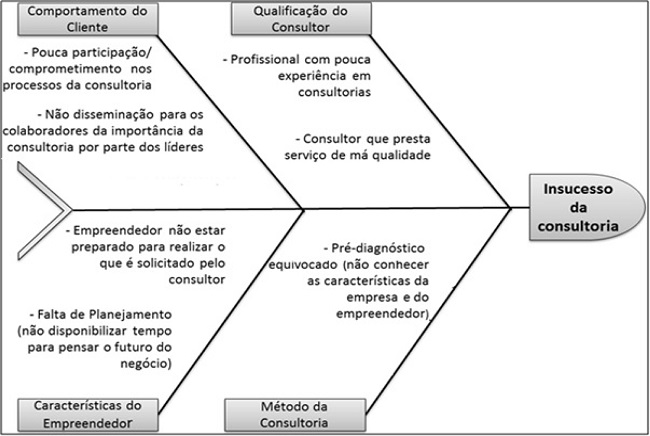 Na primeira categoria – insucesso nos serviços de consultoria – apresentou-se os principais fatores que influenciam negativamente a relação consultor-cliente. Para melhor ilustrar as causas que acarretaram os casos de insucesso, mencionados pelos representantes das consultorias e pelos empreendedores entrevistados, utilizou-se como modelo o diagrama de causa e efeito, também conhecido como espinha-de-peixe. Segundo Araujo (2008), trata-se de um diagrama que relaciona um efeito/problema a suas possíveis causas, sendo uma importante ferramenta para ações de planejamento, pois facilita organizar de maneira racional o pensamento, motivando debates mais produtivos sobre determinado assunto. O diagrama está representado na Figura 1 e corresponde a percepção dos consultores e empreendedores entrevistados quanto aos fatores que acarretam o insucesso dos serviços de consultoria empresarial.
