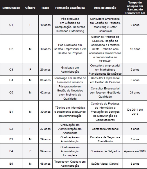 Os entrevistados estão divididos em dois grupos, o primeiro composto por gestores de empresas que prestam serviços de consultoria empresarial (categorizados pela letra C) e o segundo por empreendedores que em algum momento já buscaram o serviços de consultoria (categorizados pela letra E). Foram efetuadas dez entrevistas, das quais, além das questões relacionadas ao problema em estudo, foram coletadas informações a fim de apresentar o seu perfil, conforme quadro 1.