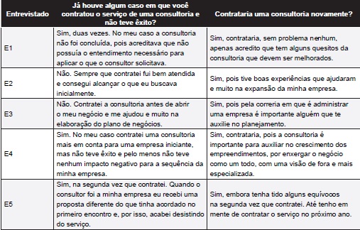 Observando o quadro, ressalta-se que, dos cinco empreendedores entrevistados, três já tiveram casos de insucesso com consultoria, mas esses casos não influenciam suas respostas quando perguntados se contratariam novamente esse tipo de serviço. Isso mostra que os empreendedores entrevistados reconhecem que a consultoria tem um importante papel para auxiliar as empresas nos processos de expansão e de melhorias na gestão.