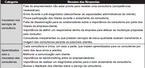 Já a segunda categoria – aprendizados com o insucesso das consultorias – proporcionou uma análise do que pode ser tirado de positivo dos casos de insucesso, sendo que cada consultoria é considerada um novo aprendizado para o consultor, do qual ele busca aperfeiçoar seus métodos de trabalho e realizar serviços mais eficientes e eficazes.