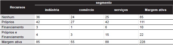 Conclui-se, portanto, que existe uma associação entre a utilização de instituições de apoio como SEBRAE e FUNTEC e a presença de recursos para inovar, na medida em que empresas que têm recursos para inovar são as que mais utilizam essas instituições de apoio. Entretanto, ainda é grande o número de empresas que têm recursos (próprios ou de terceiros) e que não utilizam os serviços das instituições de apoio (87 empresas, ou 38% do total). Por fim, observa-se que a utilização de recursos para inovar exclusivamente via financiamento e a utilização da organização de apoio ACIEG apresentam pouca associação com as demais categorias.