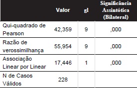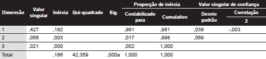 Como se pode observar na Tabela 2, o resultado obtido para a significância assintótica ao nível de significância de 5%, nos permite levar à rejeição da hipótese nula de independência das variáveis “instituição de apoio utilizada” e “fontes de recursos”, tendo em vista que o valor do qui-quadrado, com 9 graus de liberdade resulta em uma significância assintótica de 0,000 < 0,05, o que permite a aplicação da análise de correspondência, de acordo com Fávero et al. (2009).