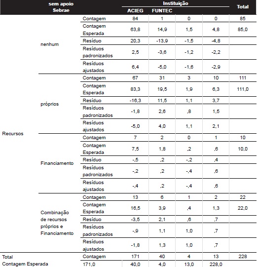 Foi realizada uma análise de correspondência envolvendo as variáveis qualitativas “instituição de apoio utilizada” e “fontes de recursos” com o objetivo de se averiguar a existência de associações entre a utilização de instituições de apoio e as fontes de recursos. Para tanto, foi realizado um teste Qui-Quadrado para se verificar a possibilidade de associação entre as variáveis, buscando-se verificar a existência de indícios que poderiam levar à rejeição da hipótese nula de independência entre as variáveis, conforme ilustra a Tabela 2.