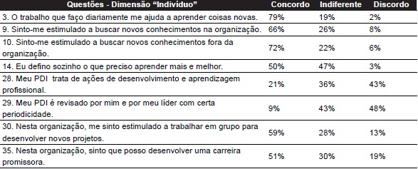 Na Tabela 1 são apresentados os percentuais de respostas a cada questão da dimensão Indivíduo. Destacam-se, inicialmente, as questões 3, 9, 10 e 14, que tratam de novos aprendizados, e obtiveram altos níveis de concordância. A questão 14, entretanto, apresentou menor índice de concordância, havendo uma equivalência muito próxima entre o percentual de concordância e o percentual de indiferença com relação à afirmação.