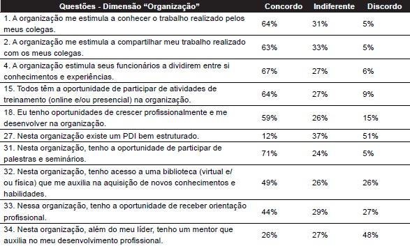 Os percentuais de respostas das questões da dimensão Organização são apresentados na Tabela 2. Os itens 1, 2 e 4 evidenciam um percentual de concordância acima de 60%, refletindo a percepção positiva dos respondentes quanto ao estímulo que recebem da organização para conhecerem o trabalho dos colegas e compartilhar seu trabalho com os demais. A questão 18 também obteve alto índice de concordância (59%), evidenciando que a organização é percebida como um espaço para crescimento e desenvolvimento profissional.