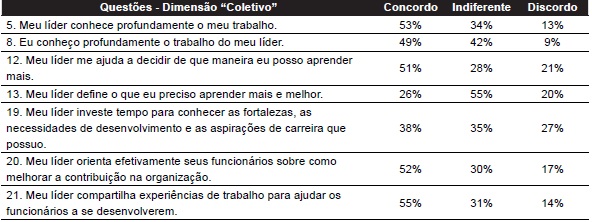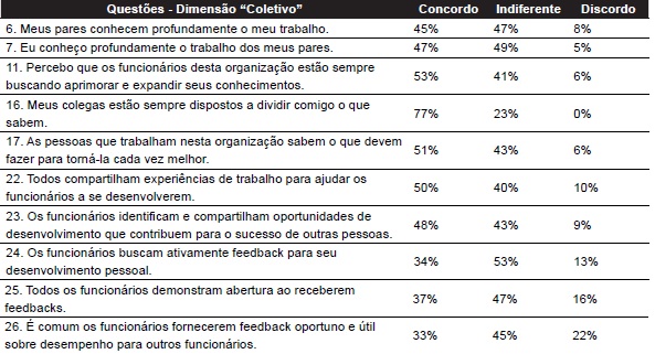 Quanto à dimensão Coletivo, apresenta-se na Tabela 3 a distribuição das respostas. As questões 6 e 7 referem-se ao interesse e conhecimento sobre o trabalho do outro enquanto grupo, enquanto as questões 11 e 17 buscam entender a percepção dos funcionários com relação à busca coletiva por conhecimento e aprendizado. As questões 6 e 7, quando sobrepostas às questões 1 e 2 da dimensão Organização, apresentam menores percentuais de concordância, 45% e 47%, respectivamente, indicando que, apesar de uma percepção positiva quanto aos estímulos que a organização oferece para a interação social, tais incentivos não são colocados em prática ou não geram significativo valor percebido pelos funcionários.