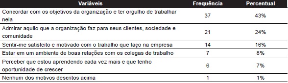 Destaca-se que apenas 7% dos respondentes escolheram a afirmativa “perceber que estou aprendendo cada vez mais e que tenho oportunidade de crescer”, que mais se aproxima do objeto deste estudo. Esse baixo percentual de valorização para o aprendizado pode estar relacionado ao contexto organizacional dos negócios sociais, no qual as tarefas diárias dos profissionais tendem a ter forte orientação para o objetivo social e, dessa maneira, os indivíduos focam seus esforços de trabalho no objetivo central da organização e deixam de priorizar o desenvolvimento profissional individual, impulsionado pela aprendizagem.