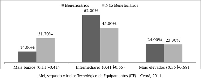 Conforme o Gráfico 1, a maioria (62%) dos apicultores beneficiários e 45% dos não beneficiários são classificados com nível tecnológico de equipamentos intermediários.