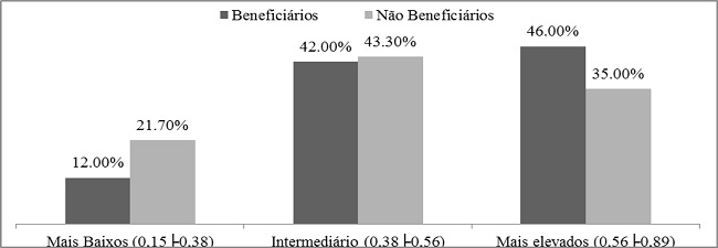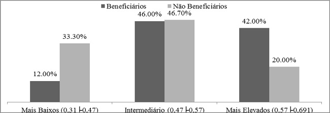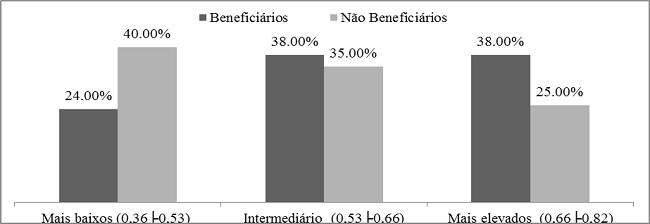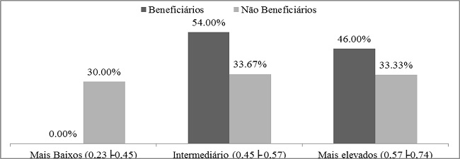 Verifica-se pelo Gráfico 3 que nenhum apicultor beneficiário do PAA possui nível mais baixo de ITCB, e a maioria destes apresenta nível intermediário. Quanto aos não beneficiários, os resultados mostram que existe uma distribuição relativamente equitativa de apicultores entre os três níveis de ITCB, porém, o maior percentual refere-se ao nível intermediário.