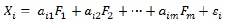 em que: X i = i -ésimo escore da variável original Xi; i = número de variáveis analisadas, onde ( i = 1, 2,..., p ); a ij = carga fatorial i no fator j; F j = fator aleatório comum; j = número de fatores gerados, onde ( j = 1, 2,..., m); ε i = fatores específicos, componente aleatório especifico para cada componente. As cargas fatoriais representam o peso da variável i em cada fator gerado, isto é, medem a importância de cada fator na composição de cada variável.