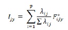 em que: I jy é o índice j (j = 1, 2, 3, 4) do apicultor y (y = 1, 2,..., 110); λ ij é o autovalor do fator i (i = 1, 2,..., p fatores extraídos) do índice j; j; F*ijy é escore fatorial i do índice j do apicultor y; λ ij λ ij /∑ λ ij ∑ λ ij é a participação relativa do fator i na explicação da variância total captada pelos p fatores extraídos no índice j.