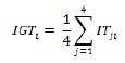 Para cada tecnologia, calculou-se um índice a partir dos respectivos conjuntos de variáveis pertencentes a cada componente. Feito isso, determinou-se o Índice Geral Tecnológico (IGT) por meio da média aritmética dos quatro índices (Índice Tecnológico de Equipamentos ( ITE ); Índice Tecnológico de Manejo ( ITM ); Índice Tecnológico de Colheita e Beneficiamento ( ITCB ) e Índice Tecnológico da Gestão ( ITG )) para cada apicultor beneficiário e não beneficiário do PAA – Mel, podendo ser representado por: