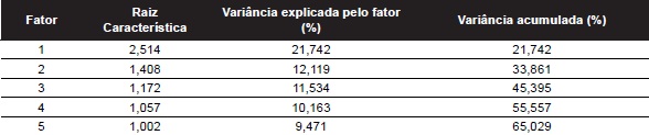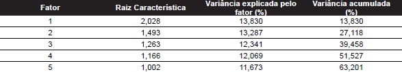 Apesar do KMO ter sido considerado baixo, já que seu valor foi de 0,516, não o torna inaceitável à aplicação da análise fatorial, conforme ressalta Fávero et al. (2009). O teste de esfericidade de Bartlett apresentou valor de 118,796, rejeitando-se a hipótese de que a matriz de correlações é uma matriz identidade ao nível de 1% de significância. Assim, a análise fatorial pelo método dos componentes principais mostra-se adequada para o cálculo do índice tecnológico de colheita e beneficiamento (ITCB). Assim, aplicada essa técnica, foram obtidas cinco raízes características pelo critério da raiz latente. Esses cinco fatores com autovalores superiores a 1, em conjunto, explicam 63,20% da variância total das 11 variáveis para mensurar a tecnologia de colheita e beneficiamento ( Tabela 5 ).