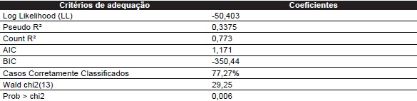 Conforme Fávero et al. (2009) e Gujarati e Porter (2011), os principais critérios de adequabilidade nos modelos de regressão logística são: percentual de casos corretamente explicados, Pseudo R 2 e Count R 2, sendo que quanto maiores, melhor está o ajustamento do modelo; estatística do Qui-Quadrado, que deve ser significante, para que o modelo possa ser utilizado; critérios de Log Likelihood - LL, AIC e BIC, sendo que quanto menores forem, mais adequado está o modelo. Para Gujarati e Porter (2011), este modelo possui, em geral, valores mais baixos para o R 2, porém a qualidade do ajustamento assume importância secundária, sendo prioritário analisar se os sinais dos coeficientes são esperados e sua significância estatística. Para esses autores, uma função é definida como logística se apresentar a seguinte funcionalidade: