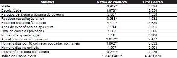 Verifica-se também que a idade reduz a chance dos apicultores alcançarem melhores níveis tecnológicos. Resultado condizente com a realidade, dado que os apicultores mais jovens são menos rígidos quanto às mudanças tecnológicas. Ademais, percebe-se que a escolaridade, capacitação antes, capacitação depois, apicultura como atividade principal, mão de obra no manejo, mão de obra capacitada e índice de capital social aumentam as chances de o apicultor ter melhor nível tecnológico na atividade, resultado também encontrado em pesquisas similares realizadas em outros municípios cearenses.