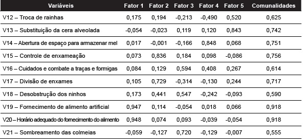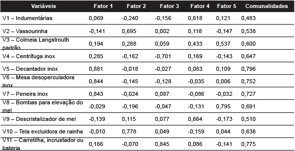 Utilizada a análise fatorial pelo método dos componentes principais, foram obtidas cinco raízes características superiores à unidade para o Índice Tecnológico de Equipamentos (ITE), sendo que esses fatores, em conjunto, explicam 65,02% da variância total das 11 variáveis de tecnologia de equipamentos utilizados na apicultura ( Tabela 1 ).