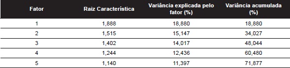 Conforme se verifica pela Tabela 3, foram obtidas cinco raízes características superiores a 1 para o Índice Tecnológico de Manejo (ITM) que, em conjunto, explicam 71,88% da variância total das dez variáveis do ITM.
