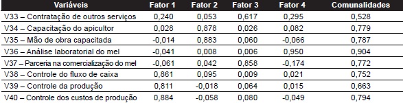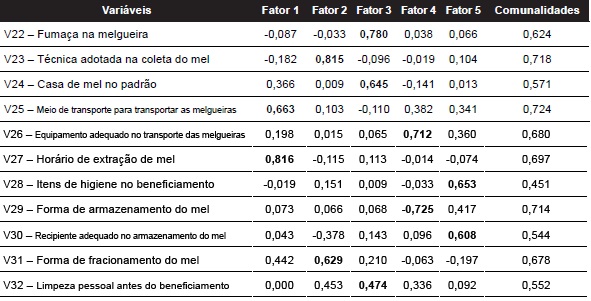 Pela Tabela 6, já rotacionados os fatores, observam-se as cargas fatoriais de cada uma das onze variáveis tecnológicas de colheita e beneficiamento, além de suas comunalidades. As cargas fatoriais com valores superiores a 0,47 (em negrito) mostram o fator com que cada variável está correlacionada. Com isso, observa-se que o Fator 1 é fortemente correlacionado com V25 e V27. O Fator 2 é correlacionado com V23 e V31. Já o Fator 3 é correlacionado com V22, V24 e V32. O Fator 4 apresentou-se fortemente correlacionado com V26 e negativamente correlacionado com V29. Uma possível razão para que a forma de armazenamento do mel esteja negativamente correlacionada com o Fator 4 pode estar associada ao fato de que 30% dos apicultores ainda não armazenam o mel, protegendo-o do calor e da umidade, conforme dados da pesquisa. Por fim, o quinto fator pode ser representado por V28 e V30.