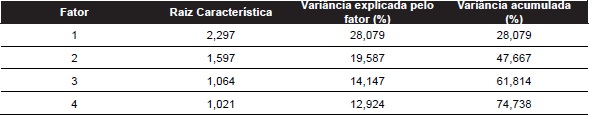 Os dados indicaram a consistência das variáveis do Índice Tecnológico da Gestão (ITG) ao emprego da análise fatorial por meio do KMO, cujo valor calculado foi de 0,623. O teste de esfericidade de Bartlett apresentou valor de 175,631, o que garantiu que a matriz de correlações não é uma matriz identidade ao nível de 1% de significância. Com base na matriz de correlações simples para o Índice Tecnológico da Gestão, foram obtidas quatro raízes características superiores a 1 que, em conjunto, explicam 74,73% da variância total das oito variáveis do ITG ( Tabela 7 ).