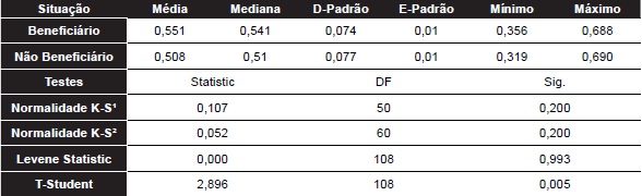 Por meio da Tabela 9, é possível observar algumas estatísticas referentes ao IGT, assim como o teste de comparação entre médias do IGT para os apicultores beneficiários e não beneficiários. A média do índice geral tecnológico adotado pelos apicultores beneficiários foi de 0,551, enquanto a dos não beneficiários foi de 0,508. Tendo em vista que as hipóteses de normalidade dos dados amostrais e de homogeneidade da variância foram aceitas, observa-se, através do teste t, que existe diferença significativa entre as médias de IGT, ao nível de 1% de significância. Portanto, os apicultores beneficiários do PAA apresentam, em média, IGT superior ao dos não beneficiários.