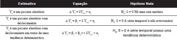 A hipótese alternativa (H1:δ < 0) para as três estimativas apresentadas no Quadro 1 é a seguinte: A série temporal é estacionária, possivelmente em torno de uma tendência determinística.