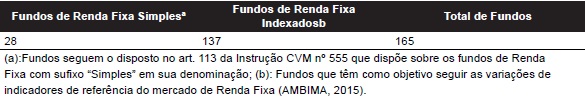 Conforme Instrução CVM nº 555/2014, os fundos são classificados como Renda Fixa, por possuírem como principal fator de risco de sua carteira a variação da taxa de juros, de índice de preços, ou ambos. Dados da Associação Brasileira das Entidades dos Mercados Financeiro e de Capitais (AMBIMA, 2015) remetem à classificação de fundos no Brasil, sendo descrito que o principal objetivo dos fundos de renda fixa refere-se ao alcance de retorno por meio de investimentos em ativos de renda fixa, sendo admitidas estratégias baseadas no risco de juros e no índice de preços e excluídas estratégias com exposição em renda variável, como por exemplo, ações.