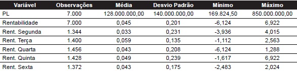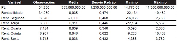 A tabela 3 demonstra que a rentabilidade dos fundos de renda fixa indexados é, em média, menor na segunda-feira e maior na terça-feira, da mesma forma que os fundos de renda fixa simples. Comparando os resultados das Tabelas 2 e 3, é possível constatar que a média do PL dos fundos de renda fixa indexados é superior à dos fundos de renda fixa simples. Constata-se, ainda, que a variação do PL dos fundos de renda fixa indexados é expressiva, sendo encontrado um desvio-padrão de 1,25 bilhões, um valor mínimo de quase 15 mil e máximo de 11,3 bilhões.