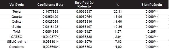 Por meio da Tabela 5 é possível observar relação positiva e estatisticamente significante a 1% entre a rentabilidade da segunda-feira e dos demais dias da semana. Porém observa-se que na terça-feira a relação é ainda mais evidente que nos outros dias da semana, sendo tal resultado coerente com a análise descritiva.