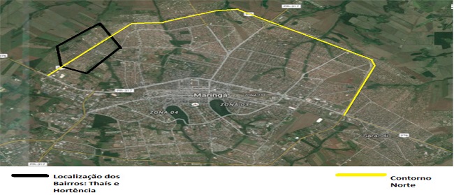 Com relação ao campo de pesquisa, este corresponde à área conhecida como via Contorno Norte, situada na cidade de Maringá-PR. Tal via compreende um perímetro de malha viária nos extremos da cidade num total de 17,2 km, com início na saída da cidade de Sarandi (PR), e chegando até a saída para Paranavaí (PR). A escolha da área a ser investigada deu-se em função da representatividade da obra para a cidade, por seus reflexos para a população local e também por contar com recursos provenientes do Governo Federal, por meio do Programa de Aceleração do Crescimento (PAC).