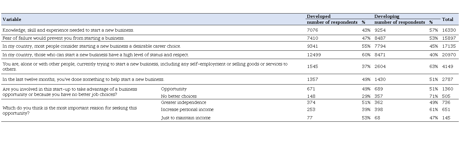 On the basis of the above results, it is possible to observe in general a greater entrepreneurial intention of the developing countries in relation to the developed countries, based on the analyzed variables. There are some exceptions where the difference favors developed countries, it would be the notion that starting a new business is regarded in the country as a desirable career choice (55%); the perception that starting a new business generates a high level of status and respect (60%); greater independence (51%) and; Maintaining income (53%) as factors to pursue a business opportunity. These findings are important because, even with scenarios of greater uncertainty and instability, developing countries have a greater margin for growth and this targeting opens the door to enterprising careers (IAKOVLEVA et al., 2007;BEZGODOV, 1999; BRUTON et al., 2008).