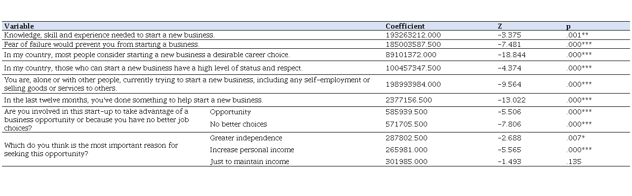 statistical significance at the level of 1%, ** at 5% and * at 10%.According to the results presented, the null hypothesis of the Mann-Whitney test is rejected. Therefore, it can be inferred that there are statistically significant differences between developed and developing countries regarding entrepreneurial intention, with the exception of the "Just to maintain income" variable, which did not present statistical significance. Based on the evidence, we cannot reject Hypothesis 1 of the study that entrepreneurial intention in developing countries is statistically higher than in developed countries.