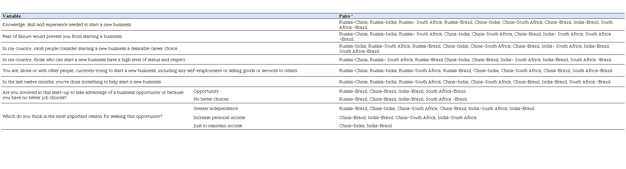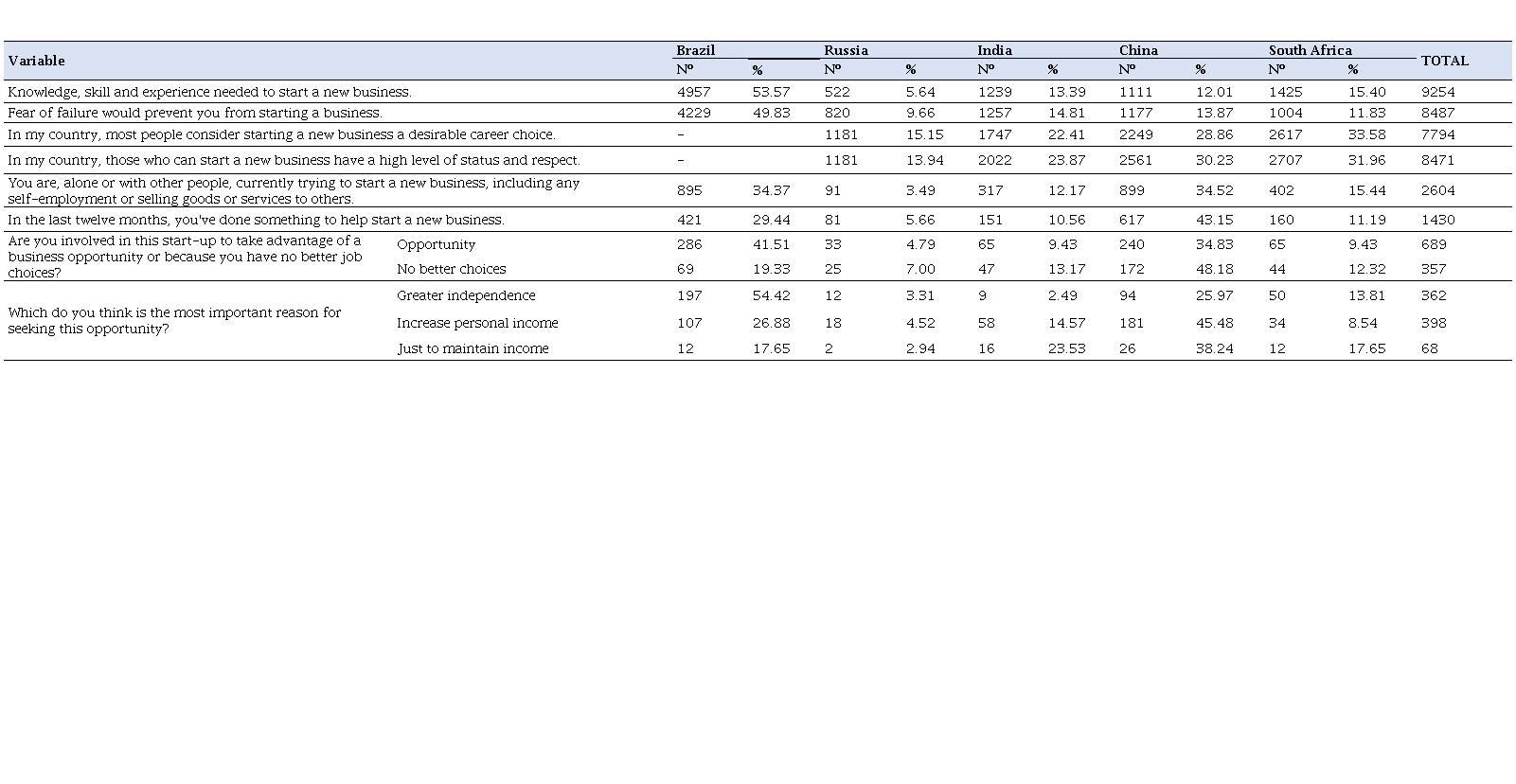 The results reveal differences among developing countries with respect to the entrepreneurs' intention on the part of the respondents. It is possible to observe that, among the countries, there is a greater difference between Brazil (53.57%) and Russia (5.64%) as to the knowledge, skill and experience necessary to start a new business on the part of the interviewee. As for the fear of failure, Brazilian are pointed out as the most fearful (49.83%) in contrast also with Russians (9.66%). Starting a business is seen as a desirable career choice mainly for South Africa (31.96%), contrasting mainly with Russia (13.94%). In the Brazilian reality, economic instability seems to aggravate this feeling, especially among women who intend to undertake (CAMARGO et al, 2018). As for Russians, these are among those interviewed in developing countries who have tried the least to start a business (3.49%) and who have helped start a new business (5.66%) differently from China, 34, 52% and 43.15%, respectively. Brazil stands out as being involved in a start-up as an opportunity (41.51%) in contrast to Russia (4.79%). These Russian entrepreneurs are less involved in a start-up for lack of opportunity (7%) than the Chinese (48.18%), which appears as the biggest motivation for these entrepreneurs. Brazilians see a business opportunity as a way to gain more independence, unlike Russians (3.31%). Chinese see the business opportunity mainly as a way to increase (45.48%) and maintain income (38.24%), again in contrast to Russians, 4.52% and 2.94%, respectively.