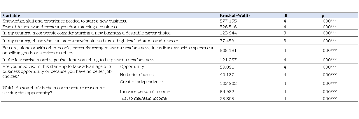 To test the differences between developing countries are statistically significant, we performed the Kruskal-Wallis statistical test in order to test Hypothesis 2 of the study, that there is difference between developed countries in the distribution of the variables of entrepreneurial intention. The results are shown in Table 4.