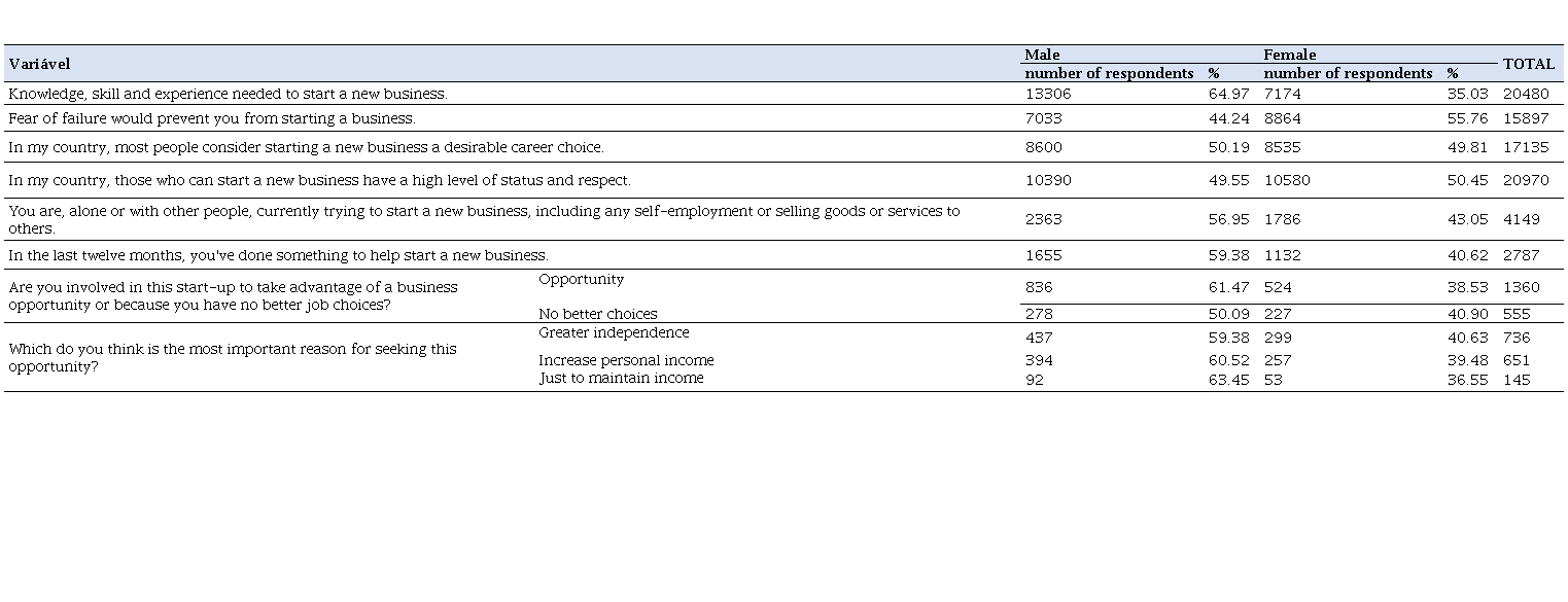 The descriptive results reveal that, in general, the masculine gender stands out as the entrepreneurial intention, considering the variables analyzed in this study, with the exception of the fear of failure to start a business, which is more common among women interviewed, revealing that men are more fearless in this area. The other exception concerns the women's perception that starting a business generates a high level of status and respect in the country they inhabit.