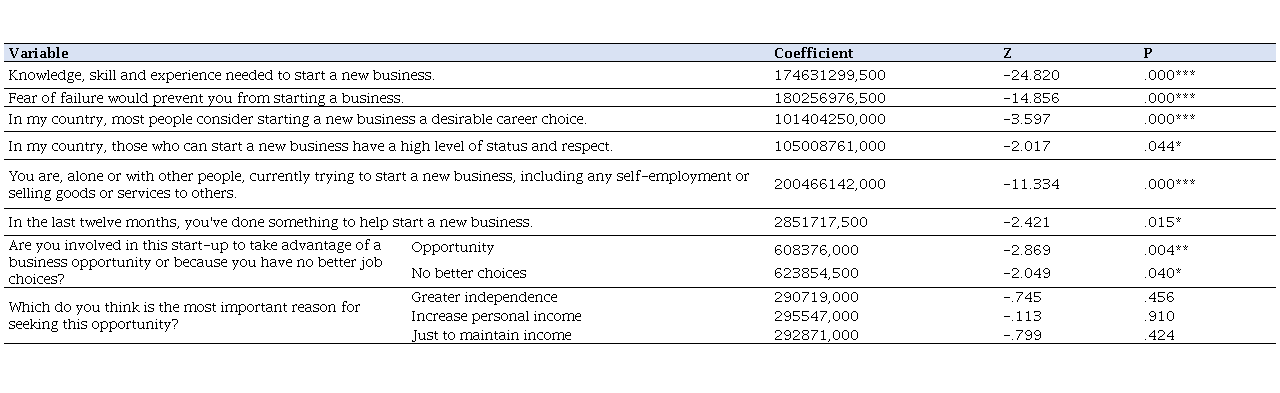 These results are in agreement with the contributions of other studies in that although developing countries have greater entrepreneurial intention, countries have unique characteristics (SOLHI; RAHMANIAN, 2016). In this way, it is not possible to group all developing countries together, but rather to analyze the scenarios and actions for the growth of entrepreneurship in the region (GHANEM, 2013; RATTEN, 2014).