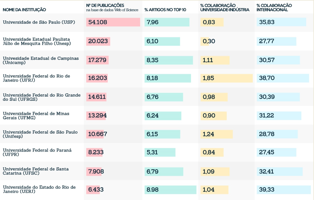 Although, University of Sao Paulo leads the ranking in absolute publication numbers, the institution is overlapped by its successors in relation to the percentage of partnerships with the industry sector. In this sense, Federal University of Rio de Janeiro stands out and shows 1.85% of its scientific articles production carried out in partnership with the productive sector. Clarivate Analytics indicates that this is due to the long-lasting relationship that those Rio universities maintain with Petrobras, which frequently presents itself as a co-author in their publications. Regarding internationalization, there is little disparity among the top 10 universities, which, in general, presents publications between 30% and 40% with foreign co-authorship. However, State University of Rio de Janeiro, once again Federal University of Rio de Janeiro and University of Sao Paulo, stand out. Federal University of Santa Catarina comes soon after, appearing as the fourth among the institutions that make up the top 10.