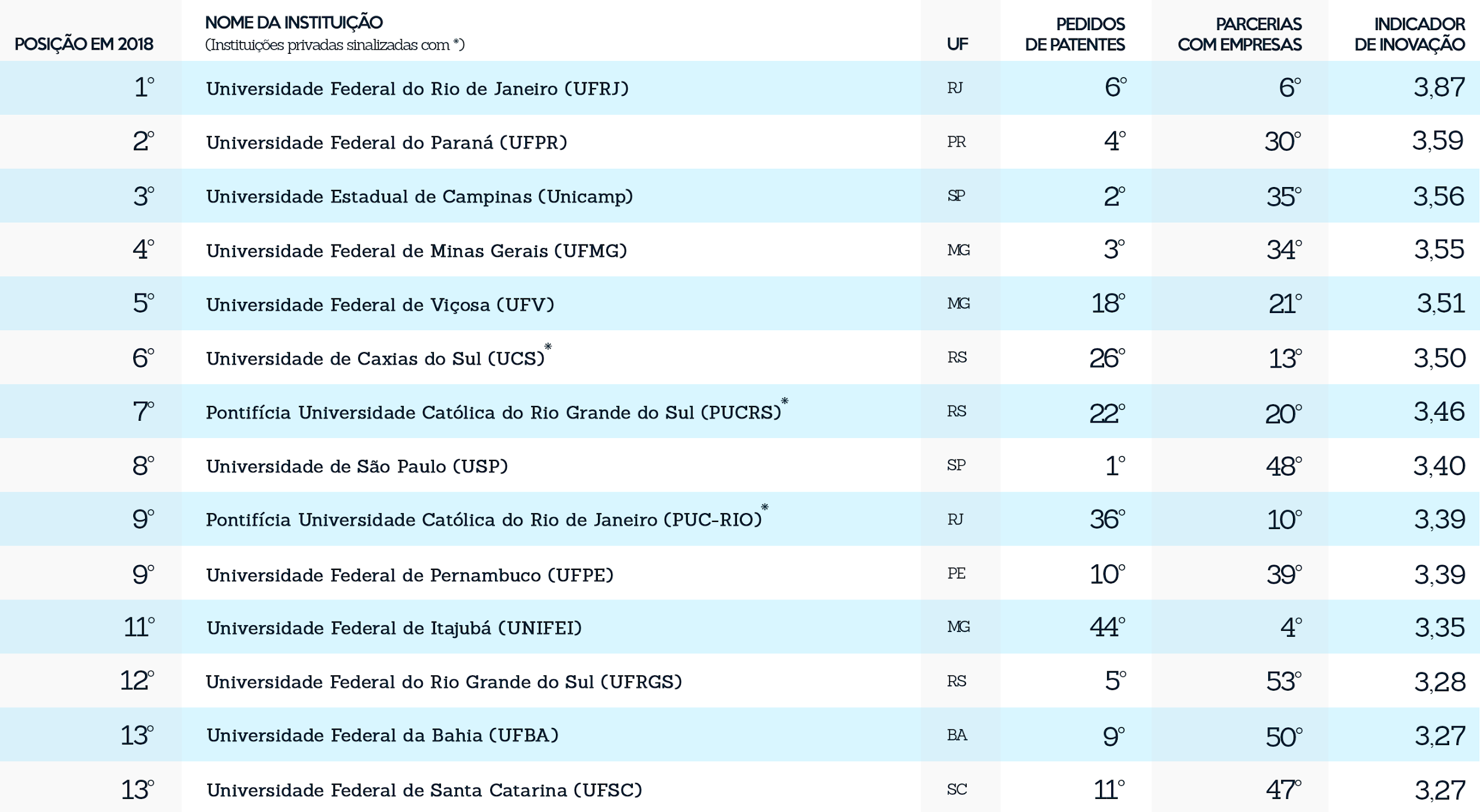 There was a kind of realocation in the educational institutions group ranking concerning the addition of the evaluation criterion referring to partnerships with the productive sector (the core of the open innovation model within the university) as an indicator of the involvement of the universities with innovation. Note that the top 10 of 2018 includes University of Caxias do Sul, Pontifical Catholic Universities of Rio Grande do Sul and Rio de Janeiro, three private institutions that demonstrate their innovation productivity beyond patent requests and surpass entities that once dominated the top of the rankings.