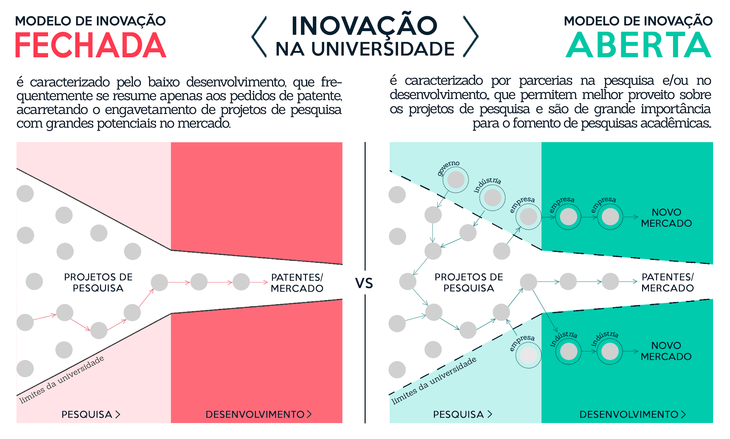 The closed innovation is characterized by research projects conducted by researchers within their own research groups, without any partnership with the market due to the high level of bureaucracy involved and because of the lack of market professionals. Thus, the results from that process are the production of research reports, scientific articles and few patent records, which could offer some market potential. On the other hand, concerning an open model, the research work and the partnerships along companies would take place freely in order to generate knowledge and exchange information during the development of the research so that robust results to the potential innovation should be directed to the market. Focusing on that, it is necessary that the NITs of Brazilian universities could be coordinated by professionals with experience in the management and innovation areas rather than professors appointed by the rectors and subjected to a change in staff at each term.