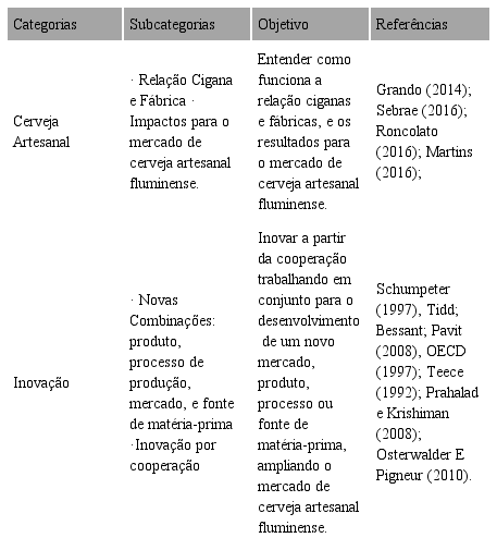 Foi elaborada uma grade fechada para a análise dos dados com duas categorias definidas a priori: cerveja artesanal fluminense e inovação. O Quadro 01 retrata as categorias e subcategorias elaboradas, juntamente, com seus objetivos e referências.