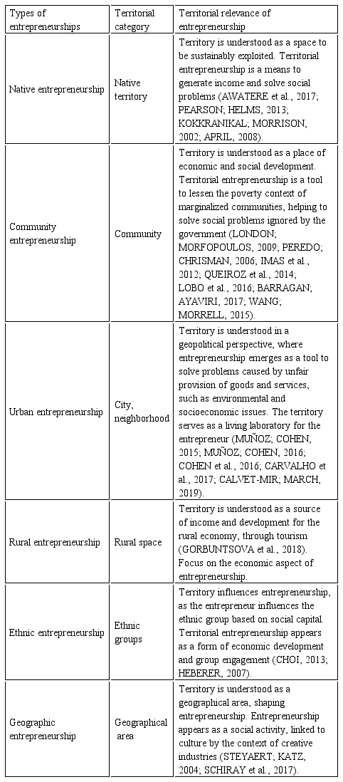 Of the types of entrepreneurships described, rural entrepreneurship concentrates the smallest number of studies. Rural entrepreneurship is an important part of the innovation and development process of communities and job creation, emerging as a vital aspect for developing the rural economy (GORBUNTS OVA et al., 2018). Its relationship with the notion of territory is superficial, where this aspect is seen as a source of income and development for the rural economy. Indigenous populations are also included in the field of rural entrepreneurship, analyzing the power exploitation that surrounds the development of the tourism industry.