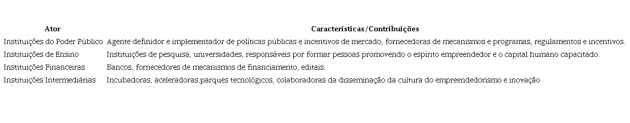 O mapeamento de atores tem representado uma necessidade e um desafio constante aos ecossistemas de inovação, pois muitos participantes não conhecem o seu papel.. Nesse estudo optou-se pelo mapeamento dos atores institucionais, acreditando-se que a descrição desses papéis poderão ampliar a capacidade absortiva dos demais que com eles possam interagir.