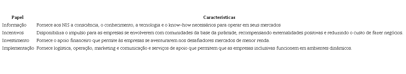 Por fim, tem-se o Sebrae que no papel de Informação contribui para o desenvolvimento dos negócios oferecendo apoio, conexões, além de inúmeros cursos e workshops mensais não especificamente para NIS, mas que envolvem temas relevantes para qualquer tipo de negócio.