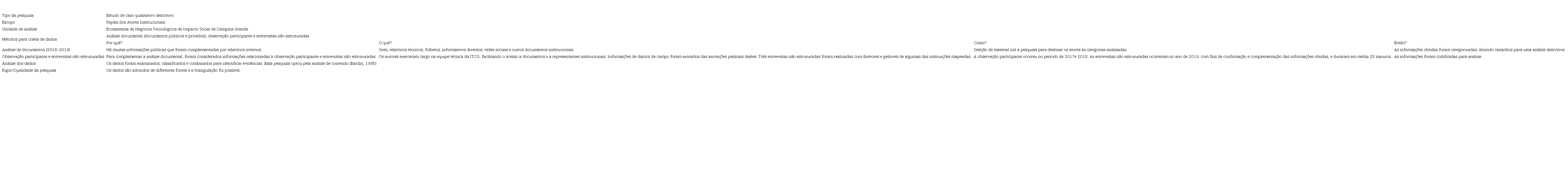 Foram utilizadas múltiplas fontes de dados, incluindo análise documental, entrevistas e observações participantes. As observações participantes decorrem do envolvimento profissional dos autores deste trabalho, que exerceram cargos de direção e assessoria na área técnica da ITCG e Fundação PaqTcPB nos anos de 2017 e 2018, o que facilitou o acesso aos dados e aos atores envolvidos. Embora a coleta dos dados dessa pesquisa tenha ocorrido em 2019, foram consultadas notas de campodecorrentes da atuação profissional dos autores, que subsidiaram o entendimento do fenômeno. Sobre as entrevistas realizadas, foram do tipo não estruturada, buscando complementar o entendimento dos autores sobre o fenômeno e envolveram a gestora da incubadora, um diretor e um assessor técnico. Essas entrevistas tiveram duração curta, menos de 20 minutos. Segundo Eisenhardt e Graebner (2007) e Yin (2016), múltiplas fontes de dados contribuem para o desenvolvimento de boas pesquisasqualitativas. A Tabela 3 ilustra o desenho metodológico do estudo, envolvendo tipo, escopo, unidade de análise, procedimentos de coleta de dados e análise de dados.