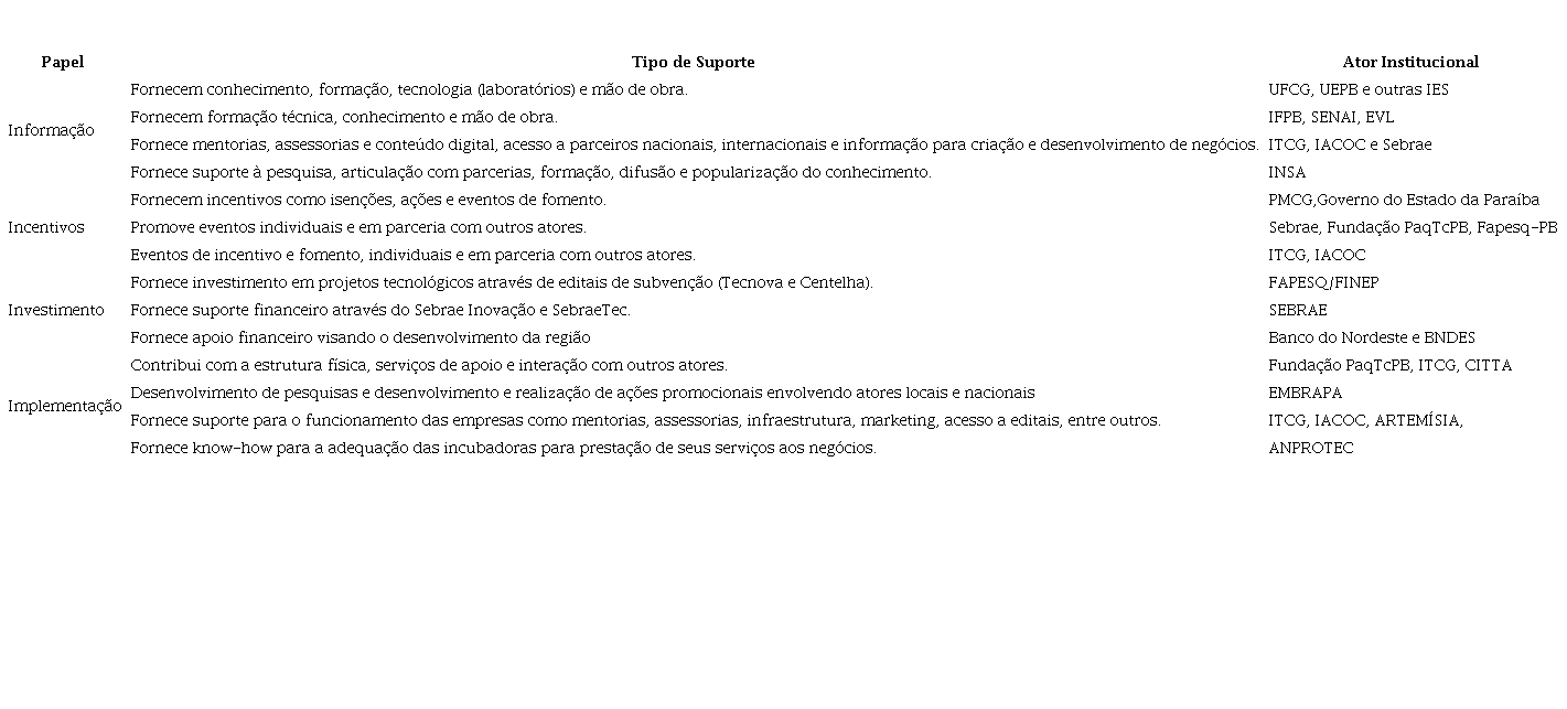 Com o papel de implementação, a ITCG e a IACOC têm por sua natureza o Programa de Incubação, dando suporte técnico e gerencial para os incubados e demais interessados por meio de assessorias jurídica e financeira, estratégia para o negócio, suporte na elaboração de projetos para editais, além da realização de eventos junto aos parceiros como os Coffee Techs, Feira de Tecnologia de Campina Grande (FETECh) e os Hackathons. Ambas as incubadoras fazem parte da Fundação Parque Tecnológico da Paraíba (Fundação PaqTcPB), que promove o avanço científico e tecnológico e possui parceria com todos os atores institucionais identificados nesse estudo. Há que se destacar ainda o papel do Centro de Inovação Tecnológica Telmo Araújo (CITTA), como um centro mais focado nas entregas tecnológicas e da Empresa Brasileira de Pesquisa Agropecuária (EMBRAPA), que contribui com o ecossistema por meio de projetos tecnológicos e inovadores voltados para o setor agrícola, promovendo ainda cursos, eventos, workshops desafios e programas.