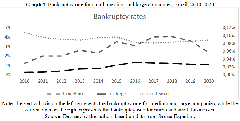 Graph 1 shows the trajectory of the bankruptcy rate for small, medium and large companies in the period analyzed. It is possible to note that, between 2010 and 2020, the bankruptcy rate for small businesses remained relatively constant. In contrast, rates for medium and large companies have shown an upward trend over the years, especially from 2014 onwards, which coincides with the deterioration of the political and economic situation in the country (NETO; CARDOSO; PENA, 2019).