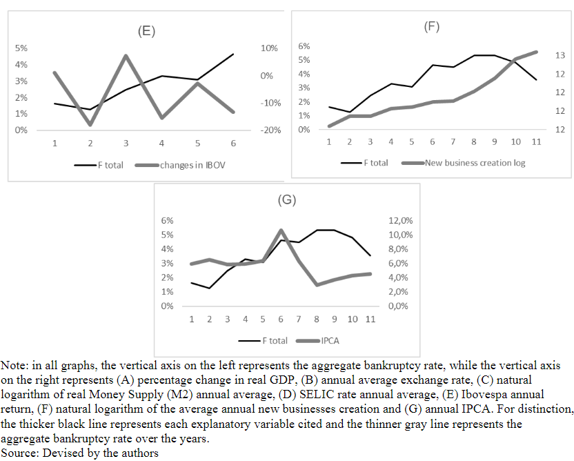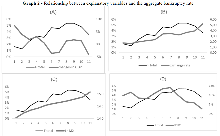 Therefore, the main motivation of this study is to examine how macroeconomic factors affect the bankruptcy of Brazilian companies. Studies that measure the impact of the economic environment on the aggregate bankruptcy rate have already been carried out around the world by using different assumptions and variables (eg, ALTMAN, 1983; PLATT; PLATT, 1994; LIU, 2009; HARADA; KAGEYAMA, 2011; ZHANG; BESSLER; LEATHAM, 2013; SALMAN; FUCHS; ZAMPATTI, 2015). For Brazil, few studies (CONTADOR ,1985; MARIO; CARVALHO, 2007; JACQUES; BORGES; MIRANDA, 2020; GARCIA, 2018) have related business insolvency and macroeconomic policy. None of those studies were conducted for companies of different sizes and nationwide. For this reason, reassessing the relationship between macroeconomic variables and bankruptcy in the country is timely and an important contribution to the literature. Managers, on the other hand, can gain insights into the importance of the macroeconomic environment in management, especially regarding the control of their liquidity and indebtedness indicators.