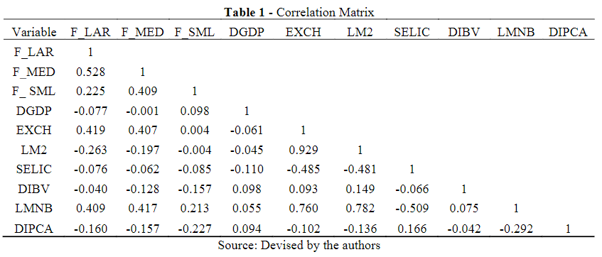 By analyzing the correlation matrix between the variables (Table 1), there is a correlation between the bankruptcies of companies of the 3 sizes, and the bankruptcy of medium-sized companies is moderately correlated with both the bankruptcy of large companies and small-sized ones. The relationship between large and small business bankruptcies is weaker, but it exists. This descriptively indicates that there may be some kind of contagion between bankruptcies of different company sizes, depending on the economic condition of the country. When assessing the relationship between economic variables and bankruptcies, it is possible to note that small companies only present weak or very weak correlations with the variables used in the model, not being so dependent on the economic situation in the aggregate. These correlations corroborate the finding in Graph 1: companies of this size apparently show a different behavior from the other two sizes of companies studied and there seems to be a constant percentage of bankruptcy over time.