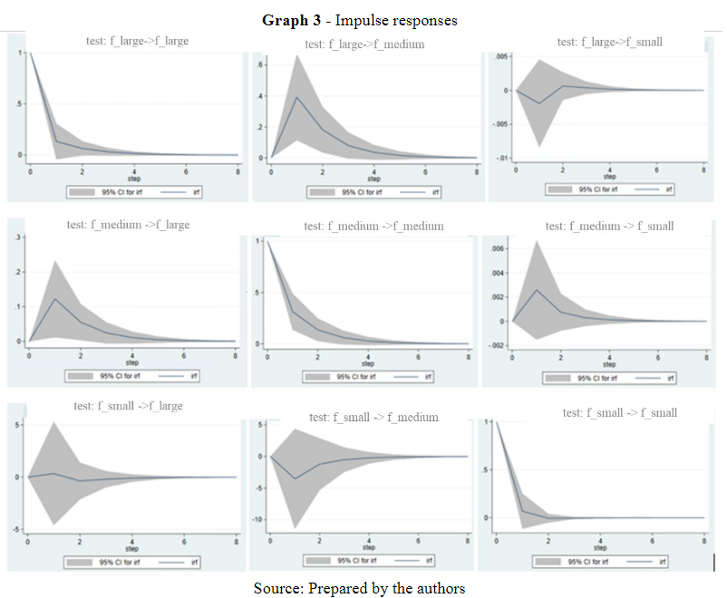 The models presented in Table 5 allow an analysis of shocks between the endogenous variables which, in this case, are the bankruptcy rates. Through this analysis, it is possible to examine whether shocks in the bankruptcy rate of a certain type of company affect the other types, both in the studied period and in subsequent periods. Graph 3 presents the results found.