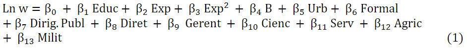As variáveis Educ (anos de estudo), Exp e Exp² (experiência e experiência ao quadrado) são as variáveis de capital humano, a experiência foi calculada pela idade do indivíduo menos a idade que começou a trabalhar. A variável B é uma binária para o grupo de vantagem branco. A variável binária Urb corresponde à área urbana, essa variável mede os ganhos salariais dos trabalhadores residentes no meio urbano sobre os trabalhadores que residem no meio rural. Foram utilizadas as seguintes categorias de ocupações: Dirig Publ (dirigentes do poder público), Diret (diretores), Gerent (gerentes e supervisores), Cienc (Profissionais das ciências e artes), Serv (serviços administrativos), Agric (trabalhadores de atividade agrícola), Milit (militares). A ocupação “técnicos” foi excluída do modelo para evitar colinearidade. Também, foram excluídos da amostra os amarelos, indígenas e sem declaração devido à baixa representatividade na amostra. Assim, a equação (1) foi estimada para homens e mulheres.