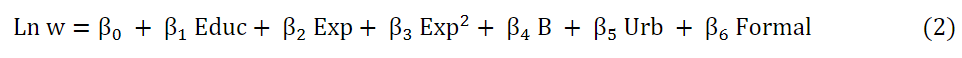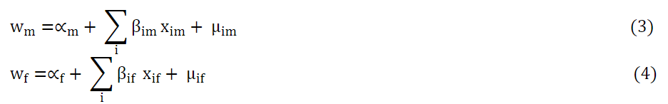 Para aplicar os procedimentos de decomposição de Oaxaca (1973) foram estimadas duas equações mincerianas pelo método dos mínimos quadrados ordinários. Uma para determinação de salários por gênero, e a segunda para determinação de salário por gênero em cada ocupação. O modelo funcional da primeira equação é o seguinte: